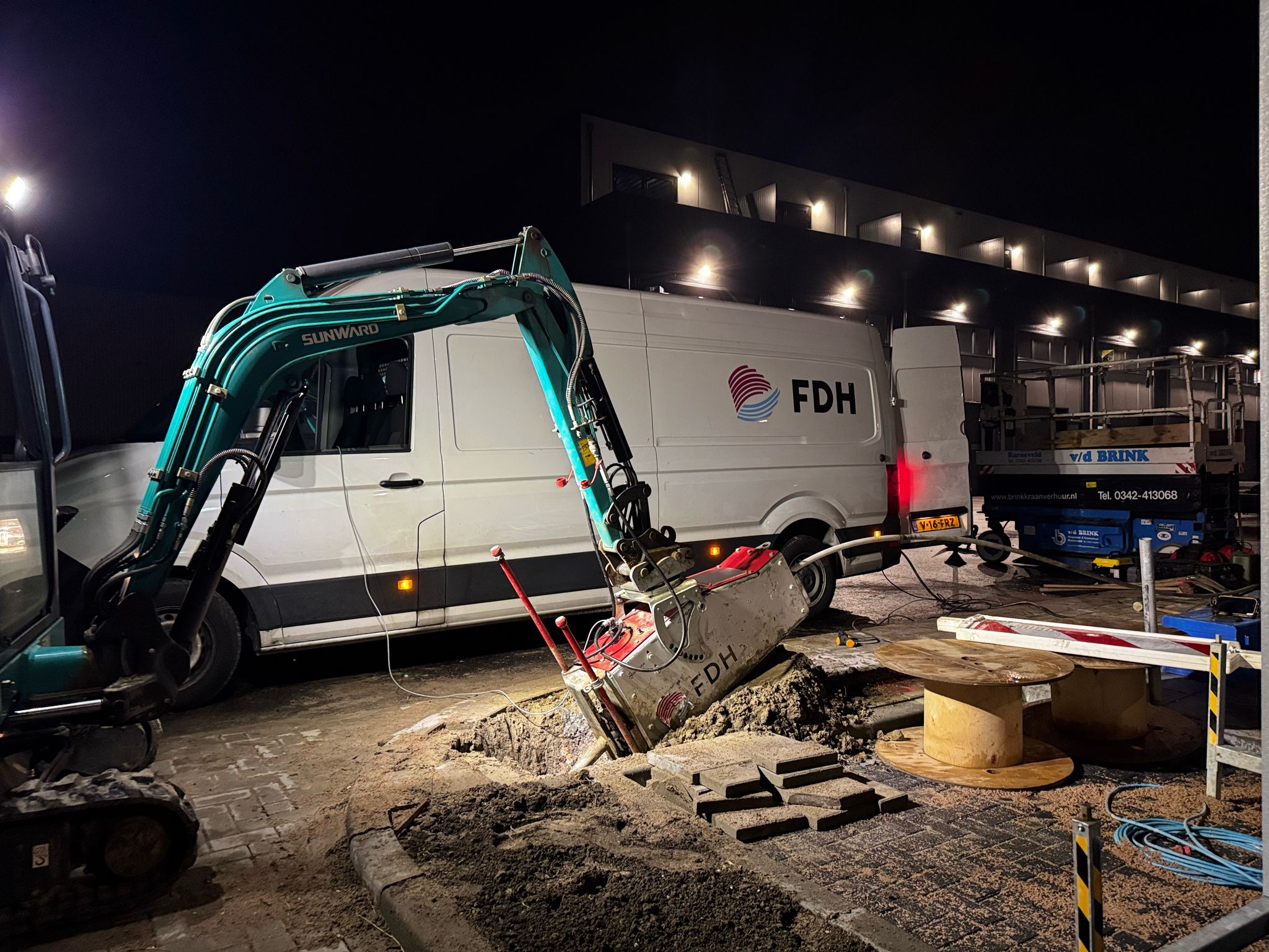 Graafwerk voor stroom- en datakabels. We werken netjes en zorgen dat alles weer dicht gaat zoals het hoort. Geen rommel, geen gedoe.